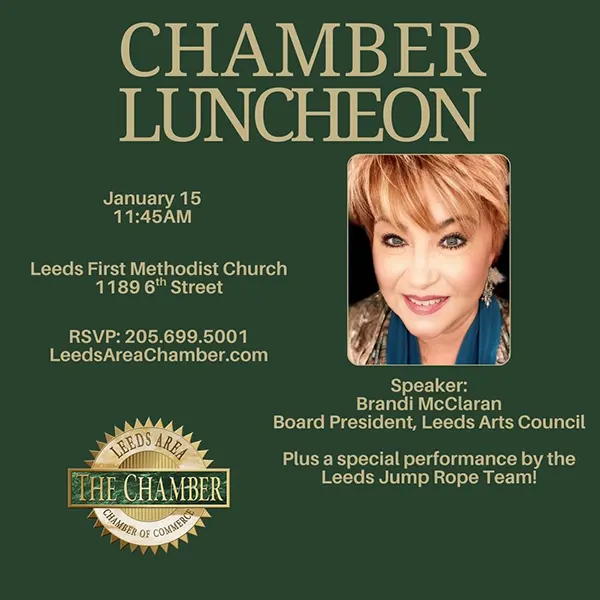 Join us for our January Chamber Luncheon on Thursday, January 15 at 11:45 AM at Leeds First Methodist Church (1189 6th Street). We are excited to welcome Brandi McClaran, Board President of the Leeds Arts Council, as our featured speaker. Brandi will share insights on the impact of the arts in our community and what’s ahead for arts…